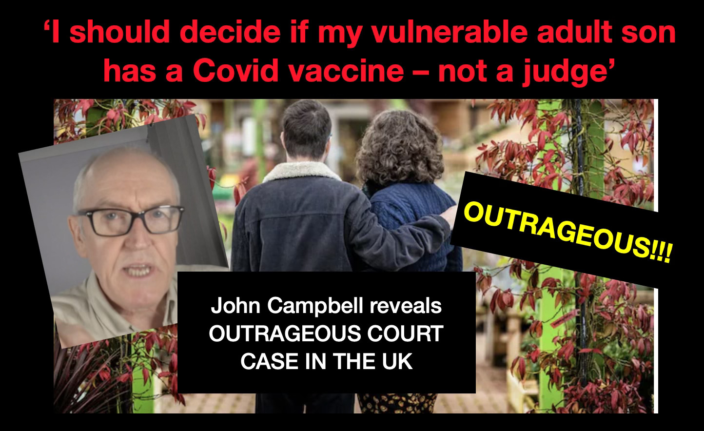 In this video, Dr John reveals the case of a mother trying to protect her 24-year-old vulnerable son who has a mental age of only 18 months from having to submit to the State concerning the enforced COVID-19 vaccine. After she initially asked her GP some very relevant questions concerning the safety of the so-called ‘vaccine’ (now firmly established to be a gene-altering therapy), she found herself having to answer questions from the social services who appeared on her front doorstep. She has since been hauled through the court system in this country for the past three years.